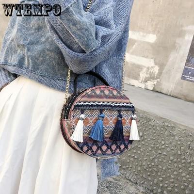 Ethnic Style Crossbody Bag Women's Retro Handmade Woven Bag Chain Strap Shoulder Bag Tassel Small Round Bag