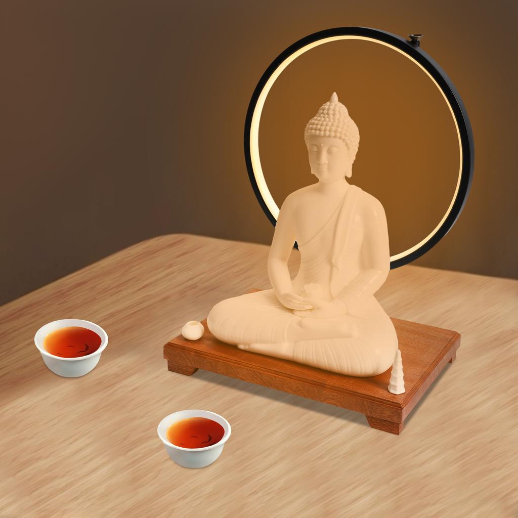 Ceramic Buddha Statue W/ LED Halo, Adjustable 6-Level Dimming, 16-In Meditation Figure, Wood Base, Zen Home Decor, Accent Light