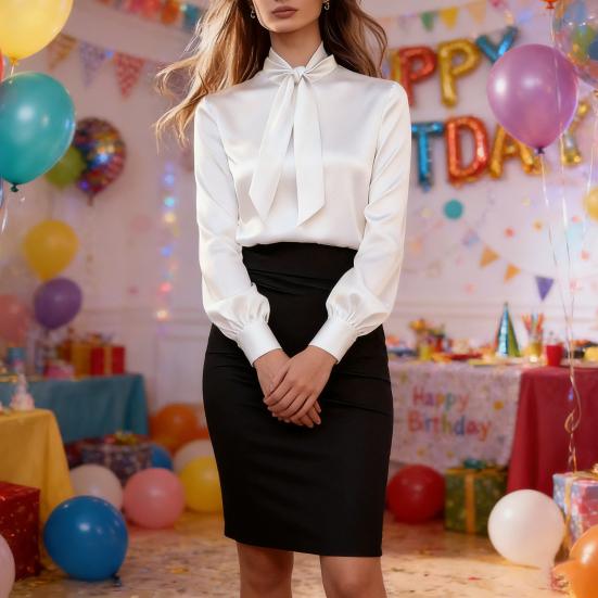 Women Shirt Stand Collar Lace-up Long Sleeve Satin Texture Shirt Solid Color Regular Fit Office Lady Shirt Spring Autumn Casual Tops