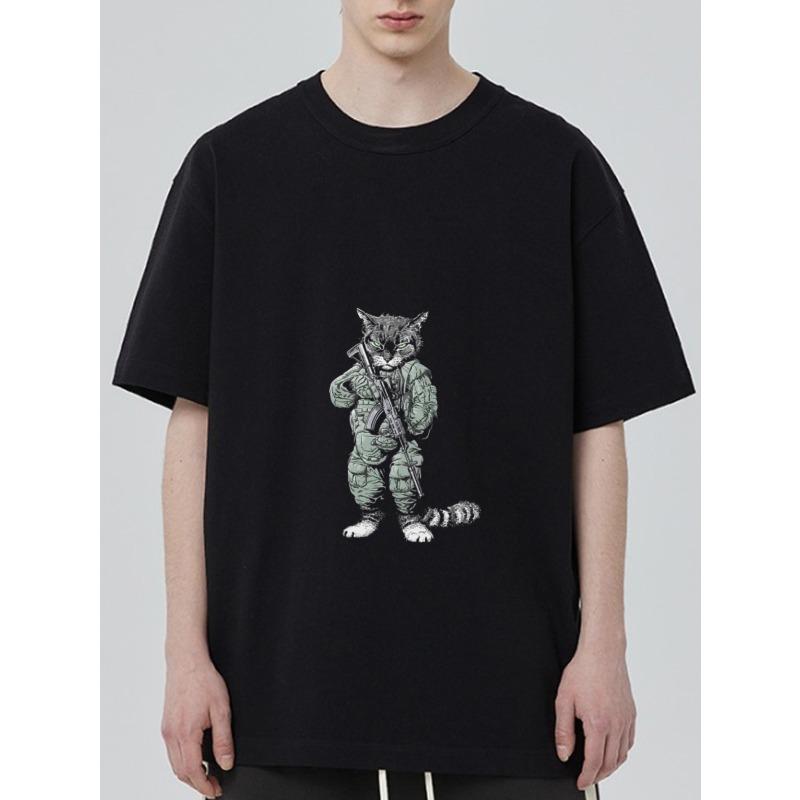 Black T Shirt with Cat Soldier Graphic Print for Casual Wear