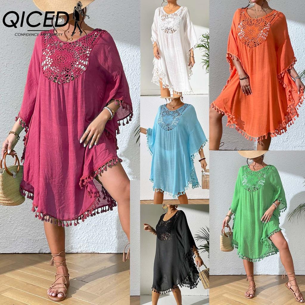 QICED Beach Dress, Beach Smock, Crocheted Patchwork Tassel Swimsuit, Bikini Outerwear