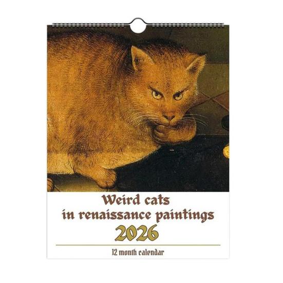Unique Renaissance And Medieval Cat Artwork: Showcasing twelve months of funny weird cats illustrated in Renaissance and Medieval art styles, this calendar offers a distinctive blend of humor and classic art. It appeals to cat enthusiasts and art lovers alike, providing a whimsical yet sophisticated decorative element for any wall.