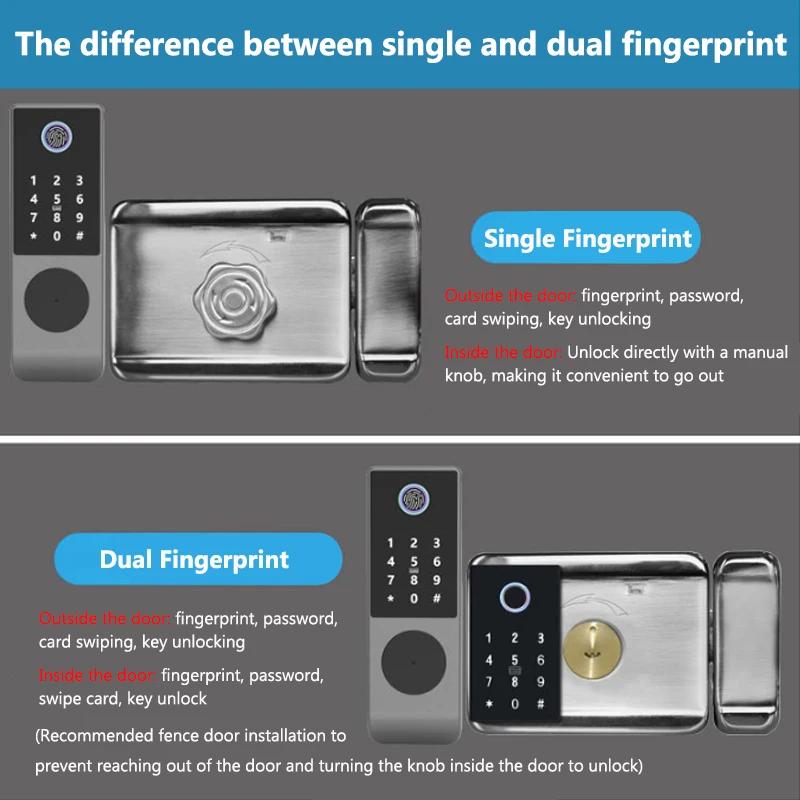 * Dual fingerprint design: both inside and outside the door support fingerprint, password, card swipe, and key unlocking. It is recommended to install it on the fence door, which can effectively prevent people outside the door from reaching into the inner door handle to unlock.
