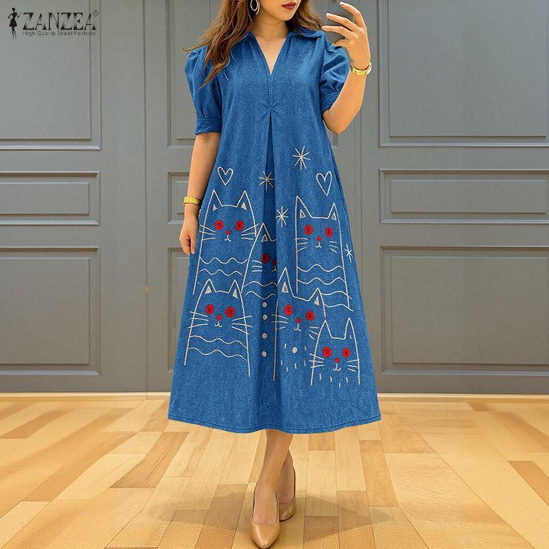 ZANZEA Women Casual V-Neck Summer Short Loose Print Dress