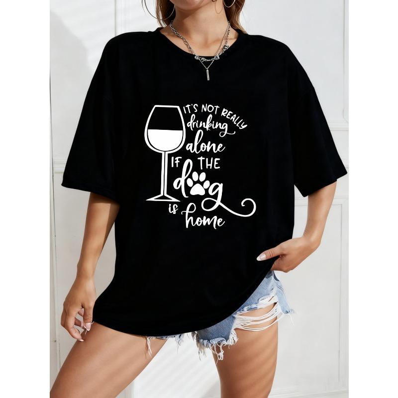 White Oversized T Shirt With Wine Glass And Dog Paw Print Graphic And Text Its Not Really Drinking Alone If The Dog Is Home For Casual Wear