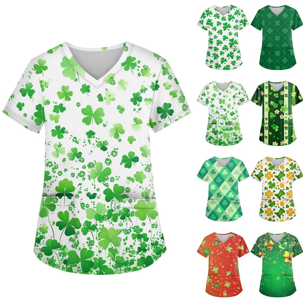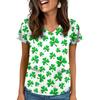 Women's V-Neck Saint Patrick's Day Print Short-Sleeve Pocket Side-Slit Top