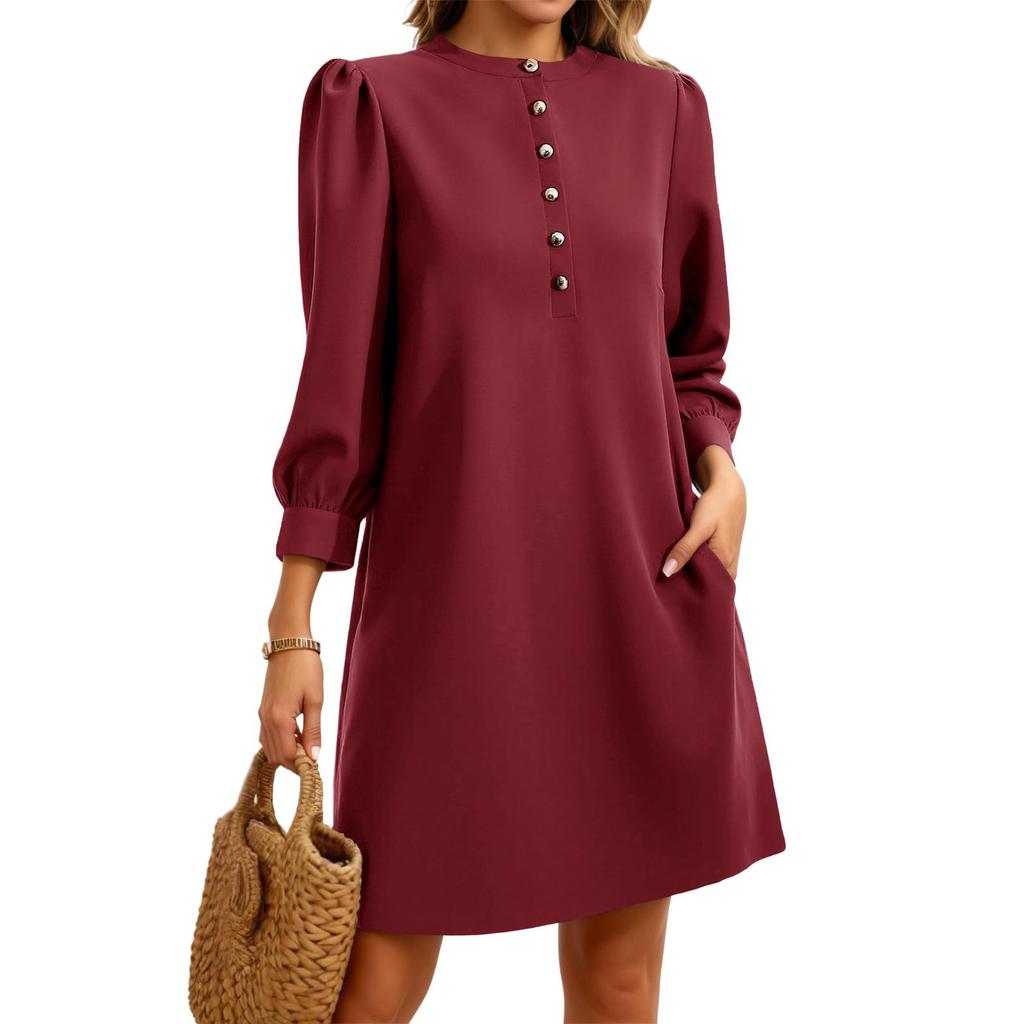 Women's 3/4 Puff Sleeve Dress With Button Round Neck, Elegant And Casual Solid Color Dress