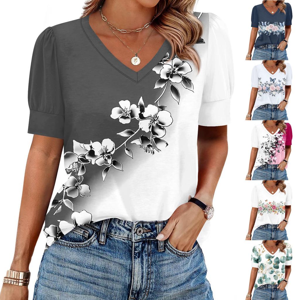 Women's Fashion Casual V- Neck Short Sleeve Print Shirt Women's Up Tops