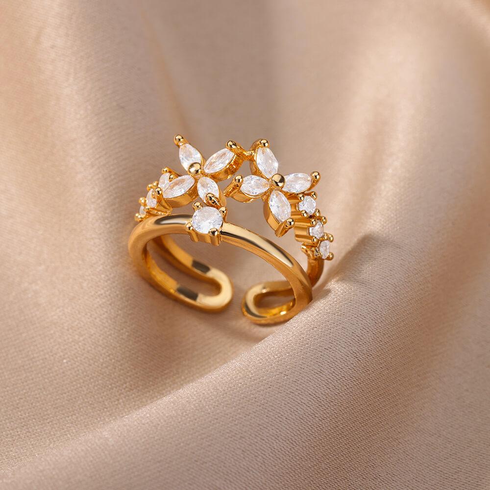 Zircon Four Leaf Clover Rings For Women Crystal Stainless Steel Double Layered Geometric Adjustable Ring Wedding Jewelry Gift
