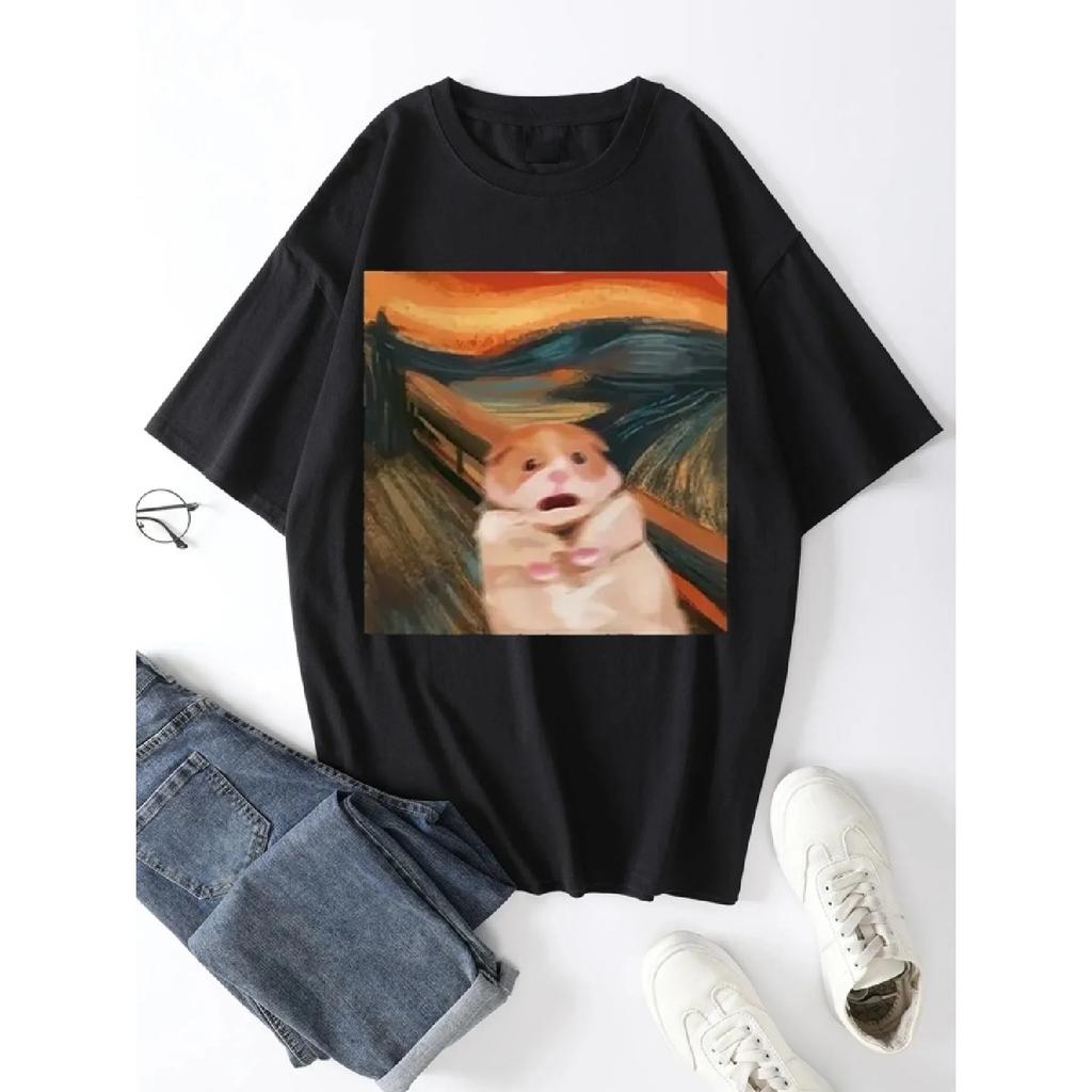 Funny Screaming Hamster Graphic Print Creative Top Casual Short Sleeve Crew Neck T-shirt Clothing for Summer Women Clothing