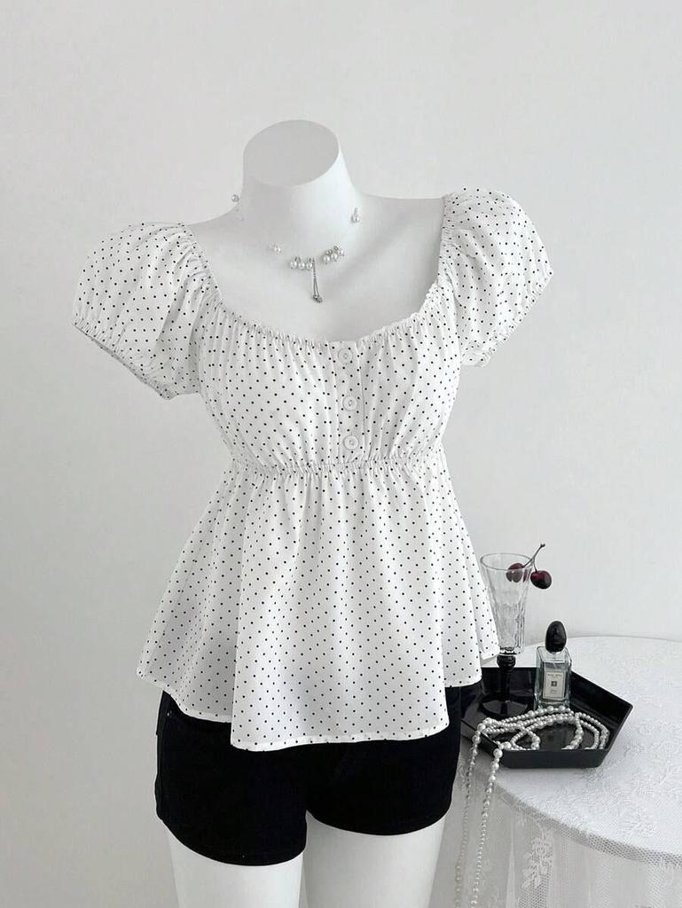 Summer 2026 Women's Polka Dot Puff Sleeve French Square Neck Slim Waist Top
