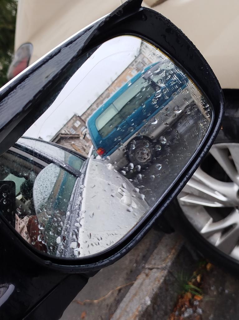 Trop grand, il a fallu le couper. Je n'ai pas très bien collé le premier jusqu'à ce que je trouve comment le faire correctement. Le deuxième s'est avéré meilleur, mais il n'a pas très bien tenu. Il y avait des bulles à certains endroits, même si j'essayais de les lisser. Je pense que cela dépend du miroir. Il remplit sa fonction, après la pluie il était transparent. J'en commanderai d'autres plus tard et les recollerai.