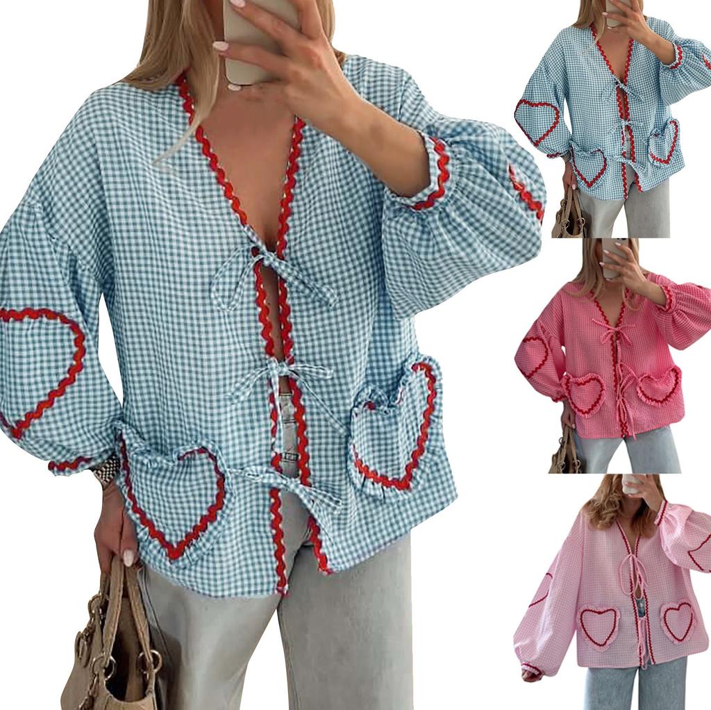Chemise à carreaux décontractée à manches longues pour femme, haut ample à bretelles et poche en forme de cœur