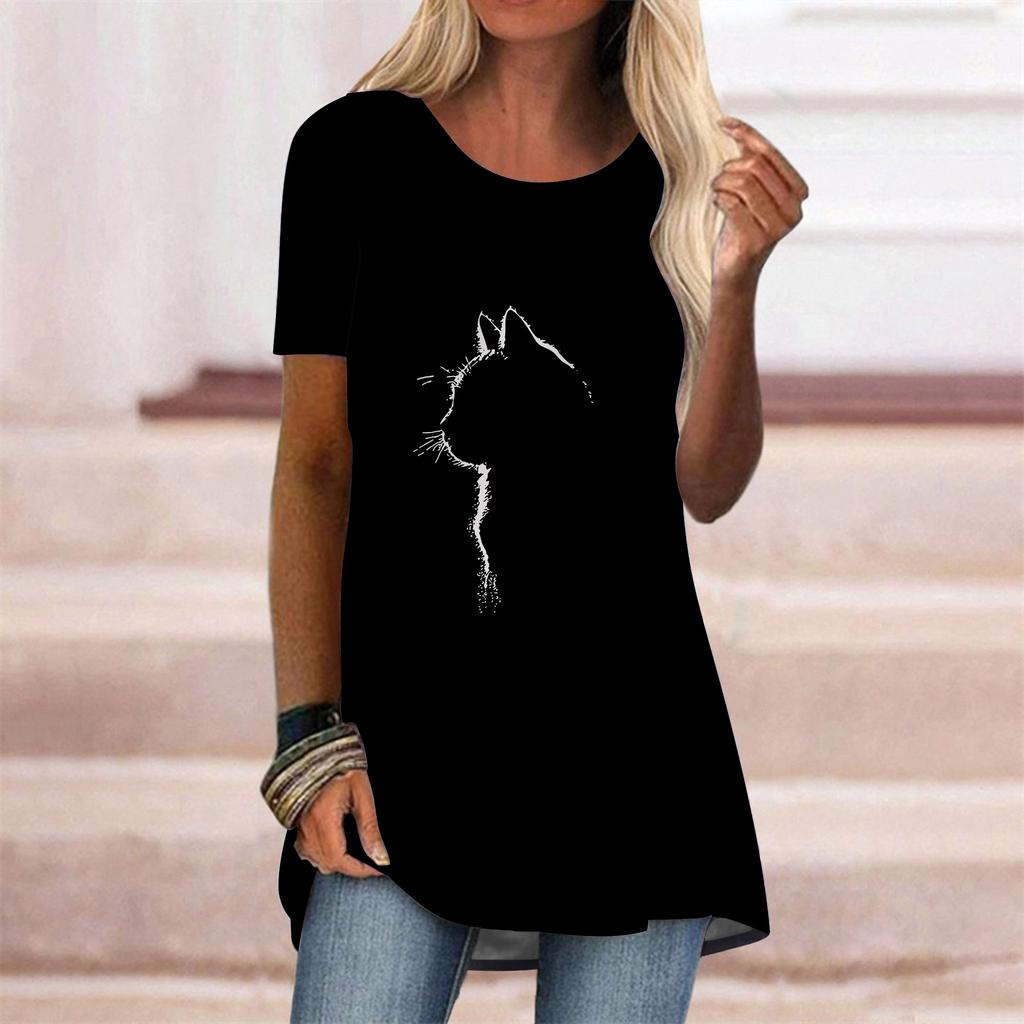 Femmes Grande Taille Été Chat Noir Imprimé Confortable Manches Courtes Col Rond T-shirt Décontracté Ample Mi-long Hauts