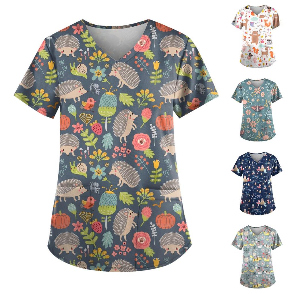 Chemisier imprimé à manches courtes et col en v pour femmes, chemisier avec poche de travail