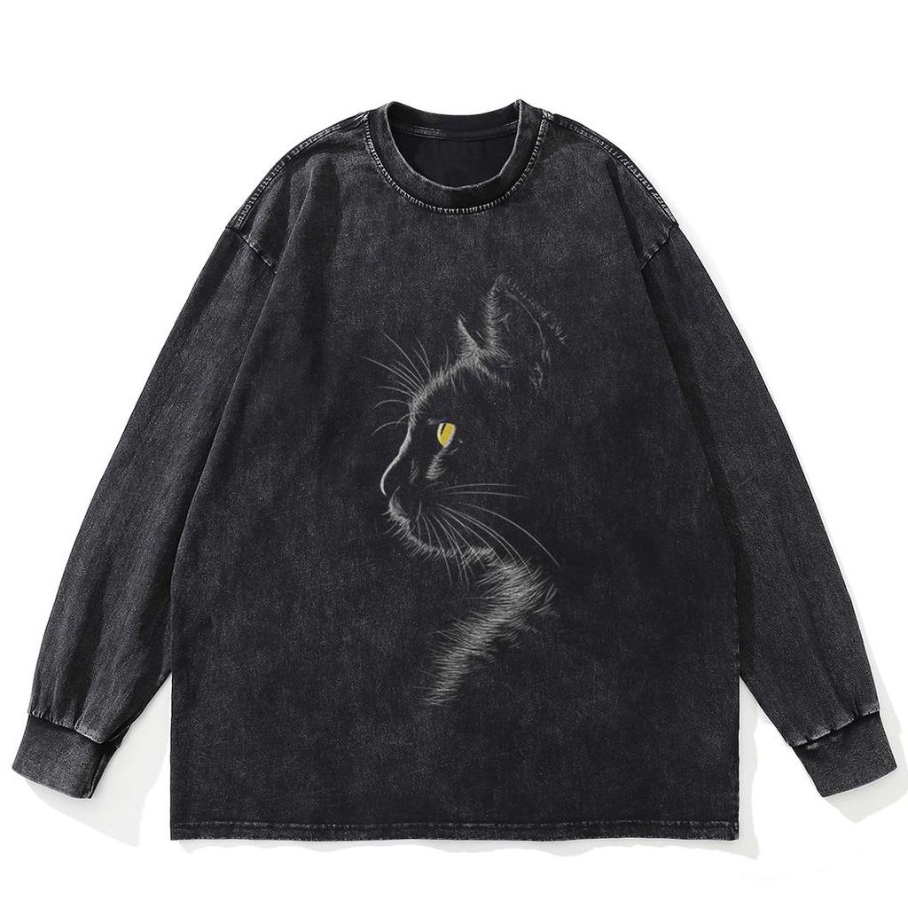 T-shirt Streetwear Graphique Chat Noir Délavé Coton Unisexe Grande Taille Manches Longues