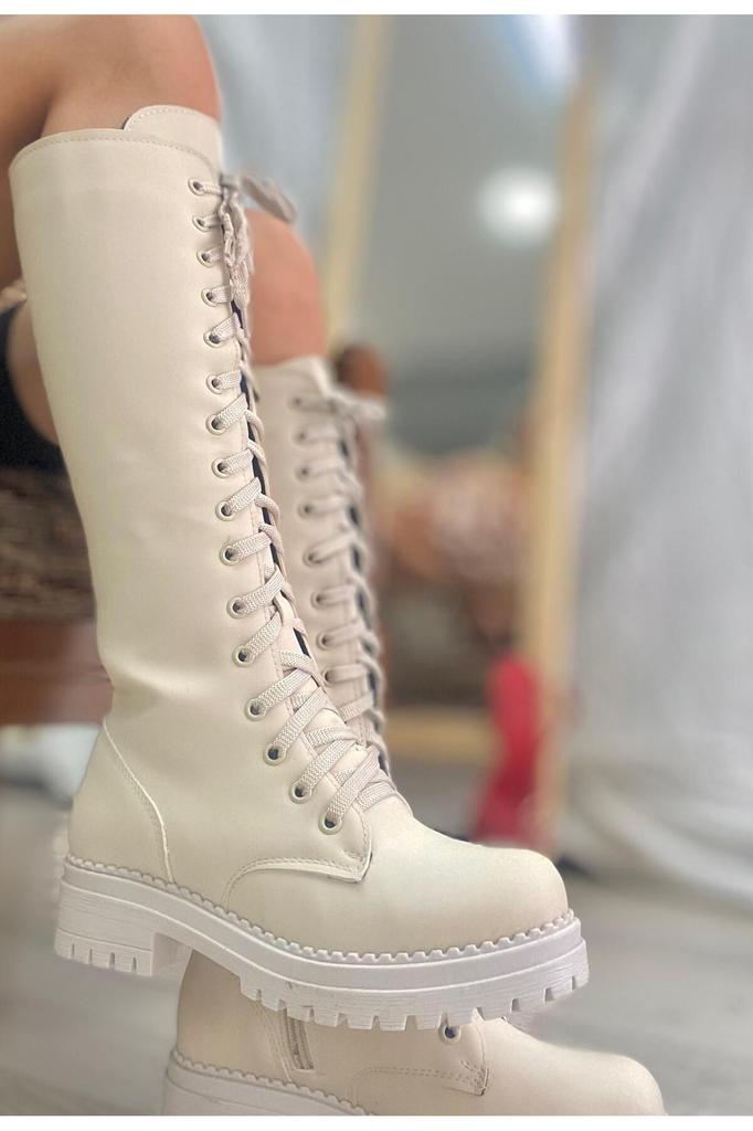 Women Modern Stylish Fashion Boots Faux Leather Cream Skin Long Lace Up And Zipper Boots