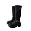 Version Cuir de Vache~ Boucle de Ceinture Mais Bottes au Genou Femme Tête Ronde Polyvalentes Semelle Épaisse Rehaussantes Noires Hautes Bottes de Chevalier Femme