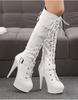 Chaussures 15Cm printemps et automne super haute viscose tête ronde taille moyenne bottes de chevalier blanc talon haut hauteur de tige haute