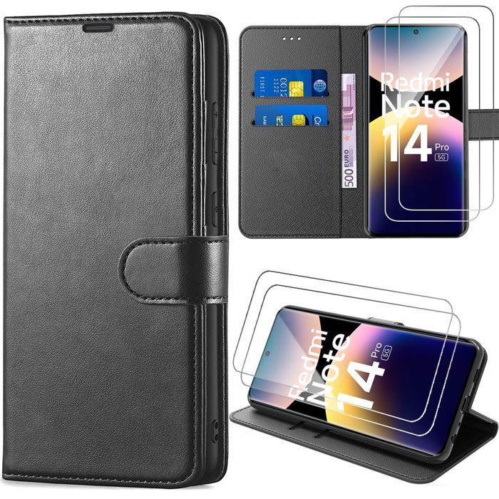 Coque - E.F.CONNECTION - Pour Xiaomi Redmi Note 14 Pro 5G - Synthécuir Noir - 2 Verres Trempés - Antichoc