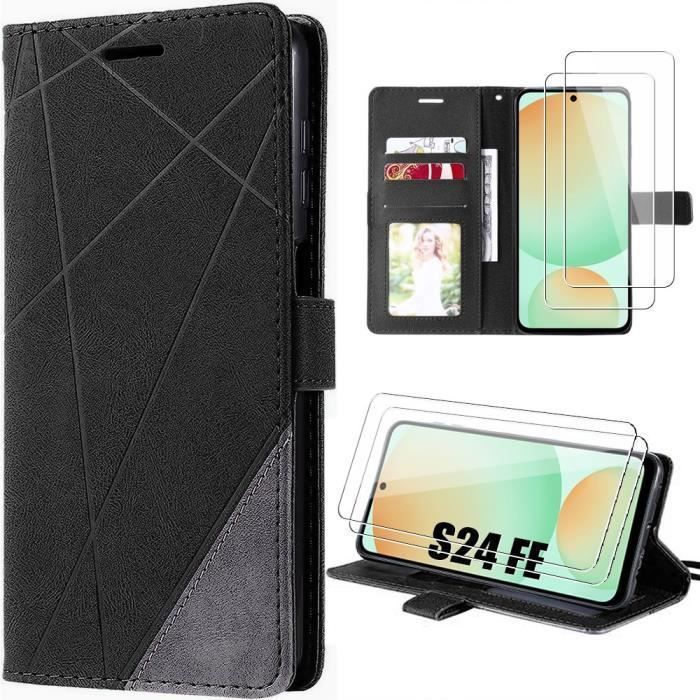 Coque pour Samsung Galaxy S24 FE - BOOLING - Effet Cuir Antichoc - 2 Verres Trempés - Etui Flip - Noir