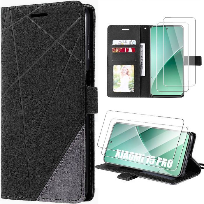 Coque + 2 Verres Trempés pour Xiaomi 15 Pro, Protection Antichoc Anti-Rayures Effet Cuir Élégant Noir