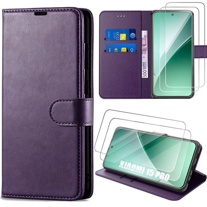 Coque et 2 Verres Trempés pour Xiaomi 15 Pro, Anti-Rayures Porte-Carte Protection 360 Degré Effet Cuir Violet Foncé