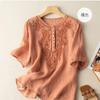 Short-sleeved summer new literary and retro loose design sense embroidery round neck thin cotton and linen women's top