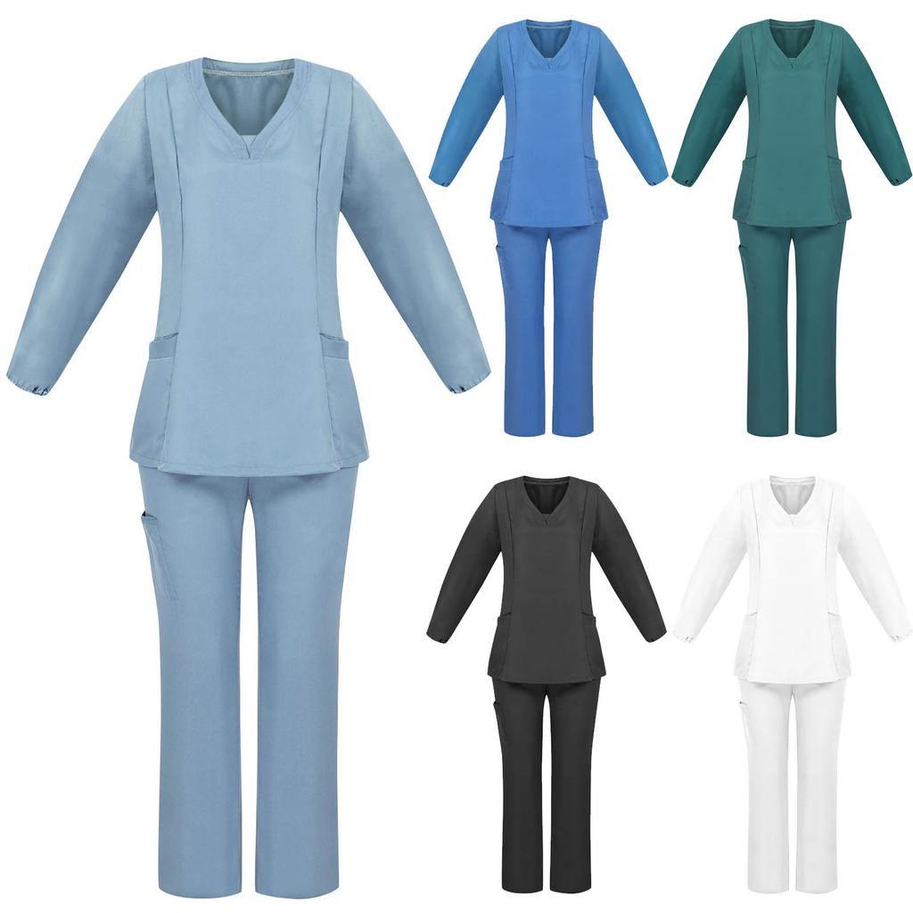 Ensemble de travail deux pièces pour femme, haut à manches longues, col en V, couleur unie, poche poitrine, pantalon à taille élastique, 3 poches, hauts de gommage pour femme