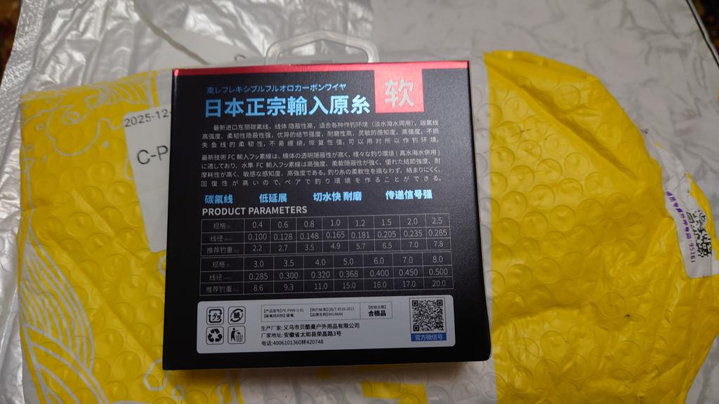 Fil fluorocarbone, pris pour essayer. Transparent. En qualité, ce ne serait pas mauvais. La taille #0,6 c'est 0,128mm et 2,7kg déclarés dans le tableau. (dernière photo)