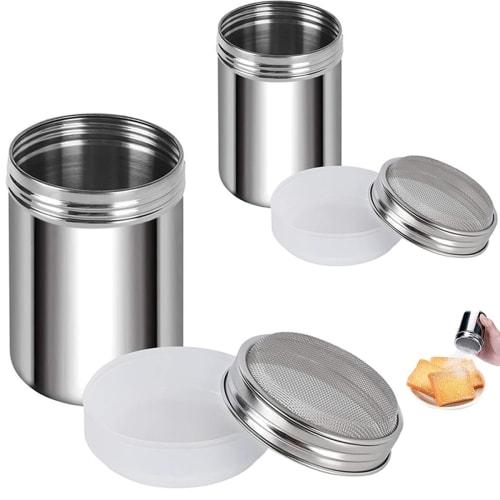 Lot de 2 Shakers à Poudre en Acier Inoxydable, Bouteilles Saupoudreuses, Boîtes à Poudre, Saupoudreuses à Condiments pour Saupoudrer Sucre, Cacao, Café, Chocolat, Poivre, et