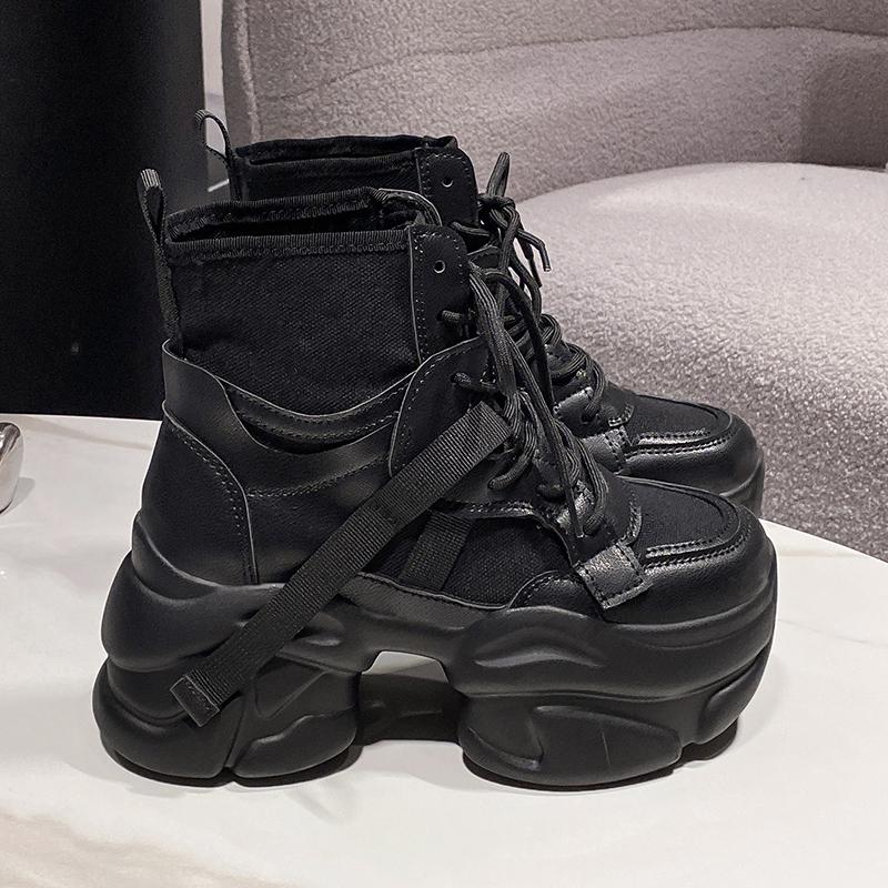 Mode Femmes Automne Toile Cuir Bottines Cheville Talons Épais 7.5CM Baskets Femme Moto Plateforme Semelle Épaisse Combat Bottines Courtes