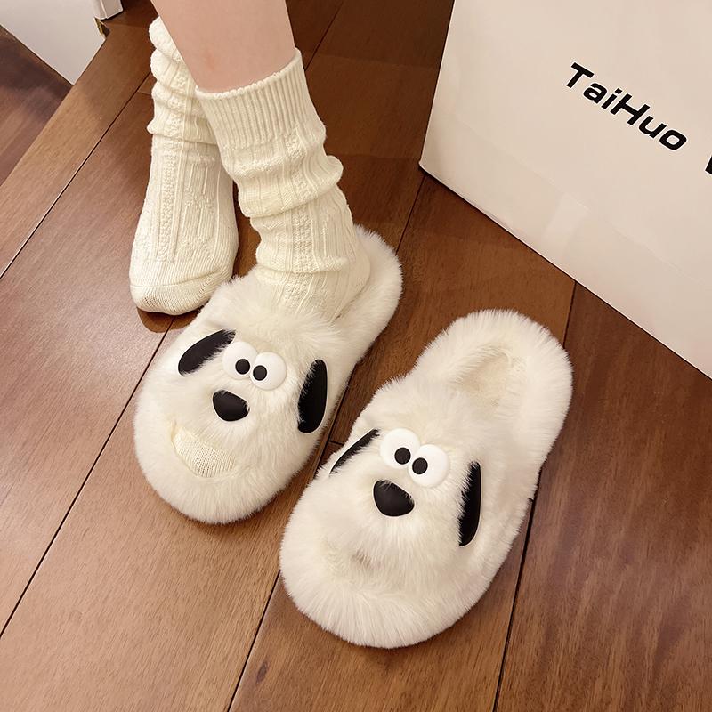 Aphixta 2024 Chaussons Mignons Chien Chaud Hiver Fourrure Femmes Chaussons d'Intérieur Chaussures Oreilles Poilues Chaussures Chambre Talon Plat Poils