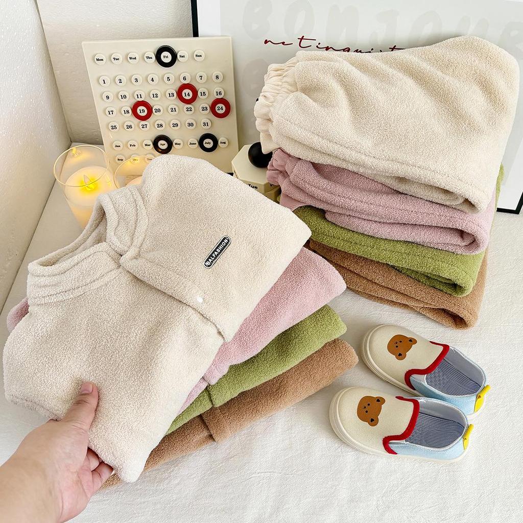 Korean Style Kids' Two-Piece Set: Stand-up Collar Fleece Sweater & Thick Pants for Fall/Winter, Unisex