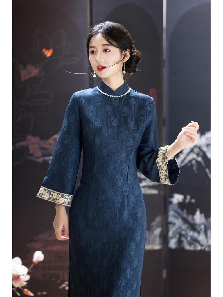 Experience the elegance and sophistication of the High-End Blue Cheongsam Dress, designed specifically for young women this autumn. This stunning dress features large, flowing sleeves that add a touch of drama and grace to your ensemble. Crafted from a luxurious blend of materials, the dress combines the durability of polyester with the texture of cotton linen jacquard fur, providing both comfort and style. Perfect for seasonal gatherings or special occasions, this dress is a timeless addition to any wardrobe.