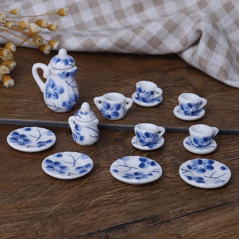 15Pcs 1:12 Miniature Porcelain Tea Cup Set Chintz Flower Tableware Kitchen Dollhouse Furniture Toys For Children Teapot DIY Toys