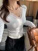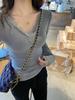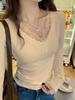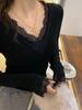 Présentant un ajout élégant à votre garde-robe d'automne, ce T-shirt à manches longues brossé à coupe slim et col en V avec bordure en dentelle pour femme est conçu pour le confort et l'élégance.. Fabriqué en viscose de haute qualité, il offre une texture douce et lisse qui est douce au toucher.. L'encolure en V est magnifiquement accentuée par une délicate bordure en dentelle, ajoutant une touche de féminité et de sophistication à votre look.. Ce t-shirt slim fit offre une silhouette flatteuse, parfait pour être porté en superposition ou seul pendant les journées fraîches du début de l'automne.