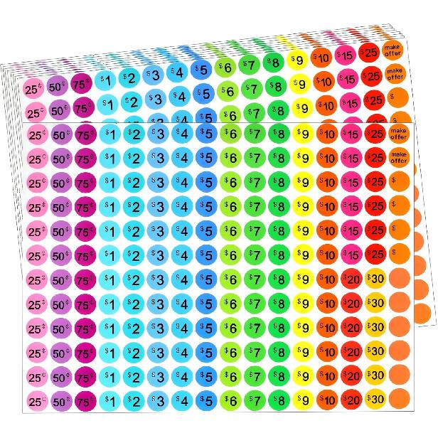Multiple Denominations & Colors: Features common price points including $1, $2, $3, $4, $5, $6, $7, $8, $9, $10, $15, $20, $25, $30, as well as 25-cent, 50-cent, and 75-cent denominations, each distinguished by a different bright color for quick recognition