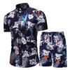 Adding a tropical touch, this man's Hawaiian shirt set features a vibrant floral plant print and an elastic waist drawstring for easy and comfortable wear.