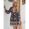 Beach Boho Vintage Floral Print A-Line Dress Summer Fall Casual Women Long Sleeve Tie Up V Neck Loose Mini Dress
