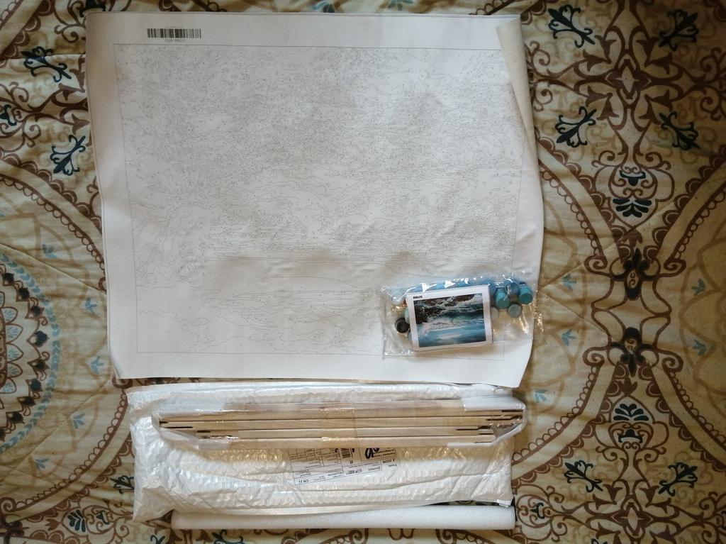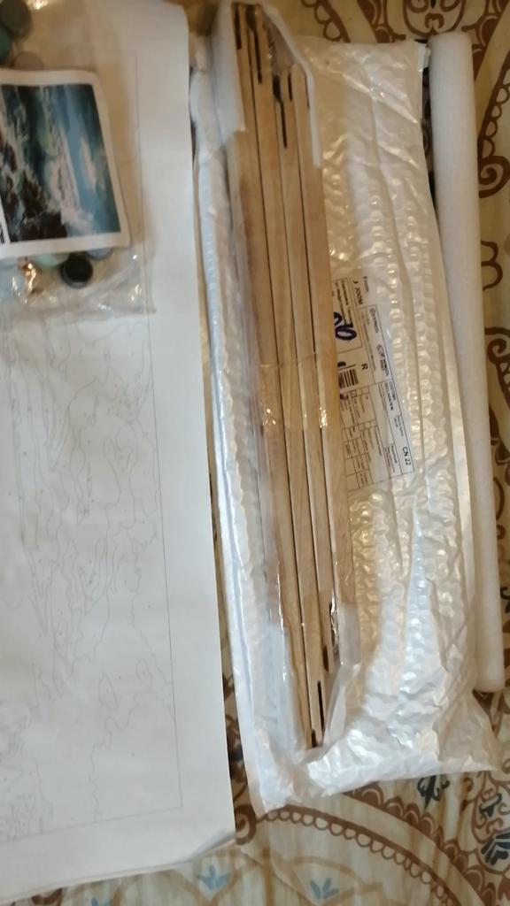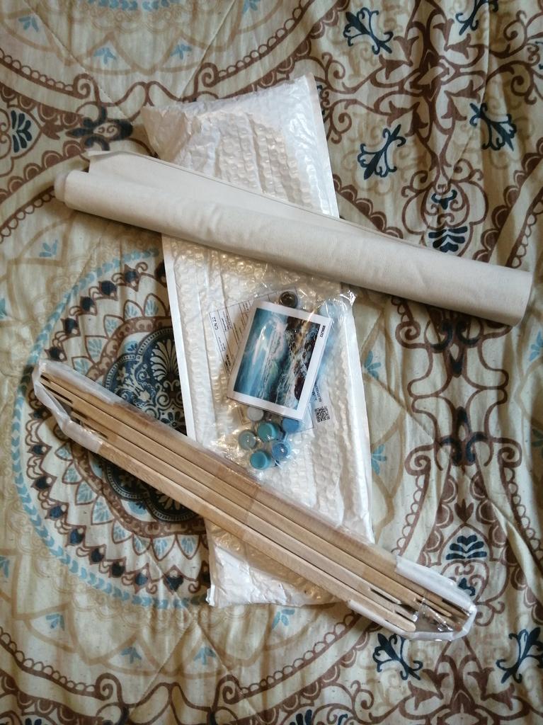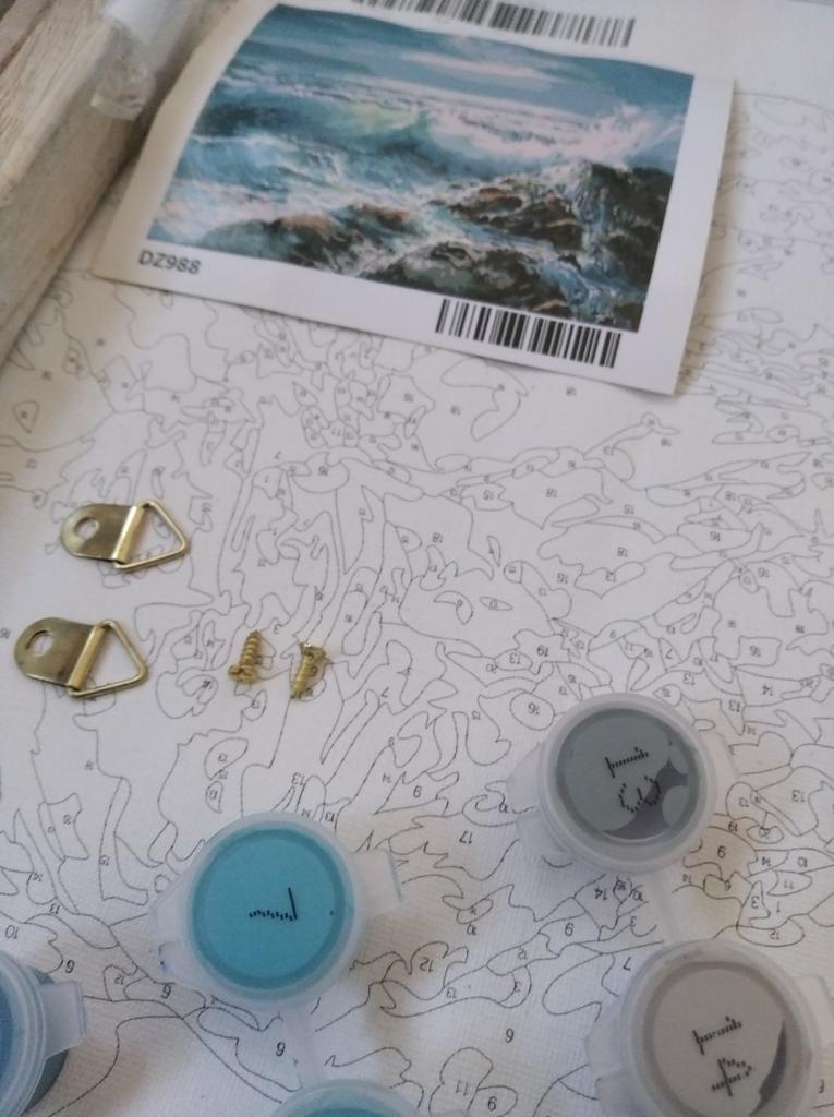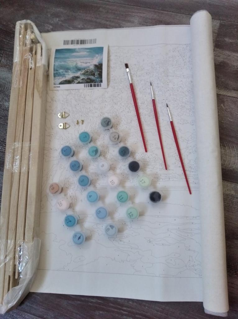 Pakken inkluderer: Lin lerret; 3 børster; 1 sett akrylmaling; Produktgjengivelse; Treramme; Tommeltapp