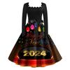 Women's Vintage Classic Dress Long Sleeve 2024 New Year Printed Square Neck Swing Dress