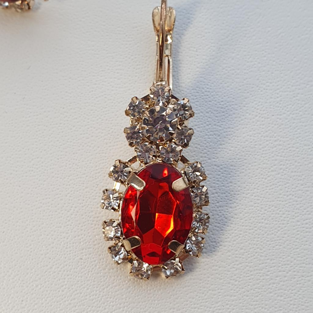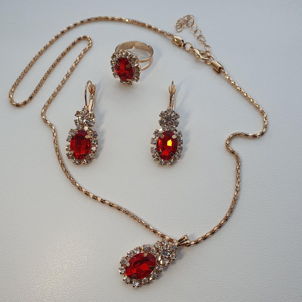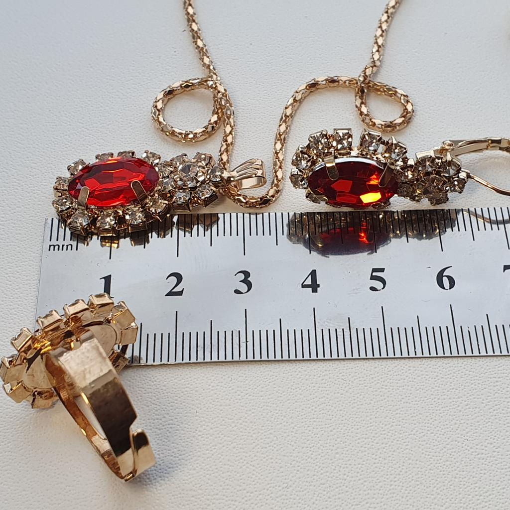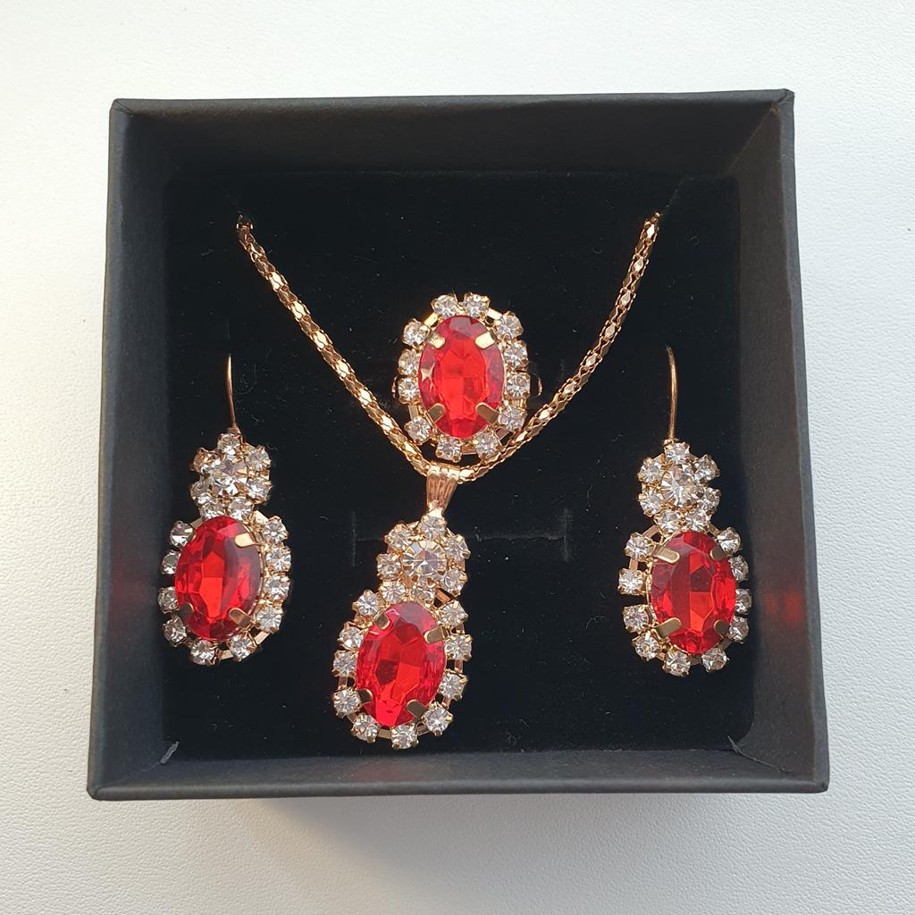 🌞 Det tredelte smykkesettet bestående av en kjede med anheng, et par hengende øredobber og en størrelsesjusterbar ring ble levert til meg meget godt pakket i Østerrike etter en leveringstid på tre uker. 🌞 Settet finnes kun i gullfarge med rød plaststein. De røde plaststeinene er kantet med hvite glitrende steiner. Halskjedet har en veldig praktisk, stor lås som også enkelt kan holdes med kunstige negler. Settet er veldig lett og jeg vil si at det er et kostnadseffektivt kostymesmykke som sikkert kan kombineres elegant eller uformelt. Selvfølgelig er det ikke et high-end produkt kvalitetsmessig, men jeg er av den oppfatning at det har et veldig bra pris-ytelse-forhold og kan anbefales! De hengende øredobbene krever ikke en ekstra lås da de har en integrert foldelås og dette er selvfølgelig veldig praktisk! For elskere av motesmykker 👍💃. Musikk av Capcut pro
