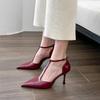 Summer Ladies Pumps Fashion Pointed Toe Ankle Strap Buckle Patent Leather Wine Red High Heeled Sandals Women