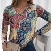 V-neck 3D Ethnic Style Printed Top Fashionable Casual Long Sleeved Women's T-shirts
