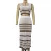 Stylish Knitted Set: Elevate your wardrobe with this women's casual long skirt suit featuring a sleeveless knitted top and a high-waisted slit hem miniskirt. The striped patterns and hollow details exude elegance and charm.