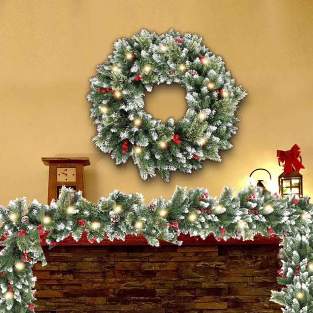 9ft Opplyst Julekrans, Opplyst Kunstig Blomster-Trekrans for Peishylle, Forhåndsinstallert Belysning Imiterte Grønne Jul Vinterkrans