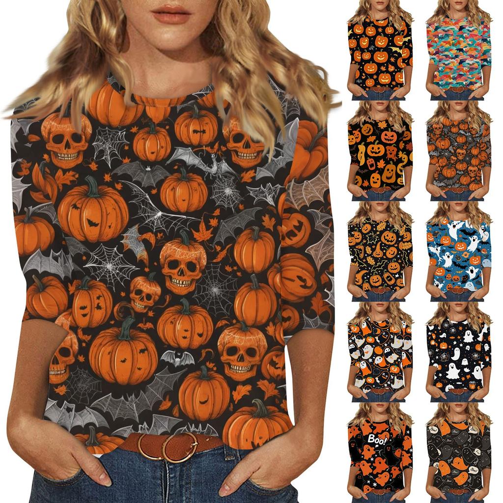 Dame Mote Casual Trekvartsermet Halloween Trykket Rund Hals Topp