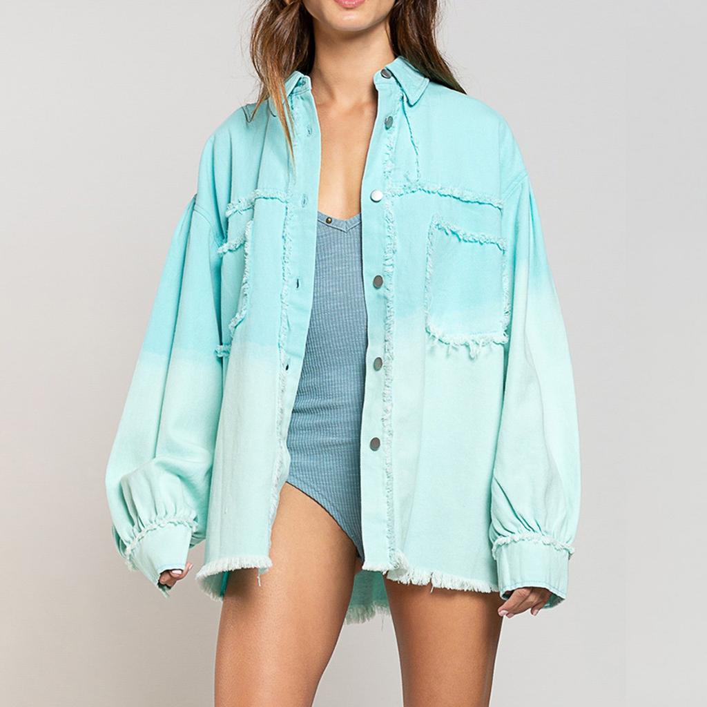 Women Loose Casual Denim Jacket Female Jacket Tie-Dye Trim Tassel Long Sleeve Coat With Pockets