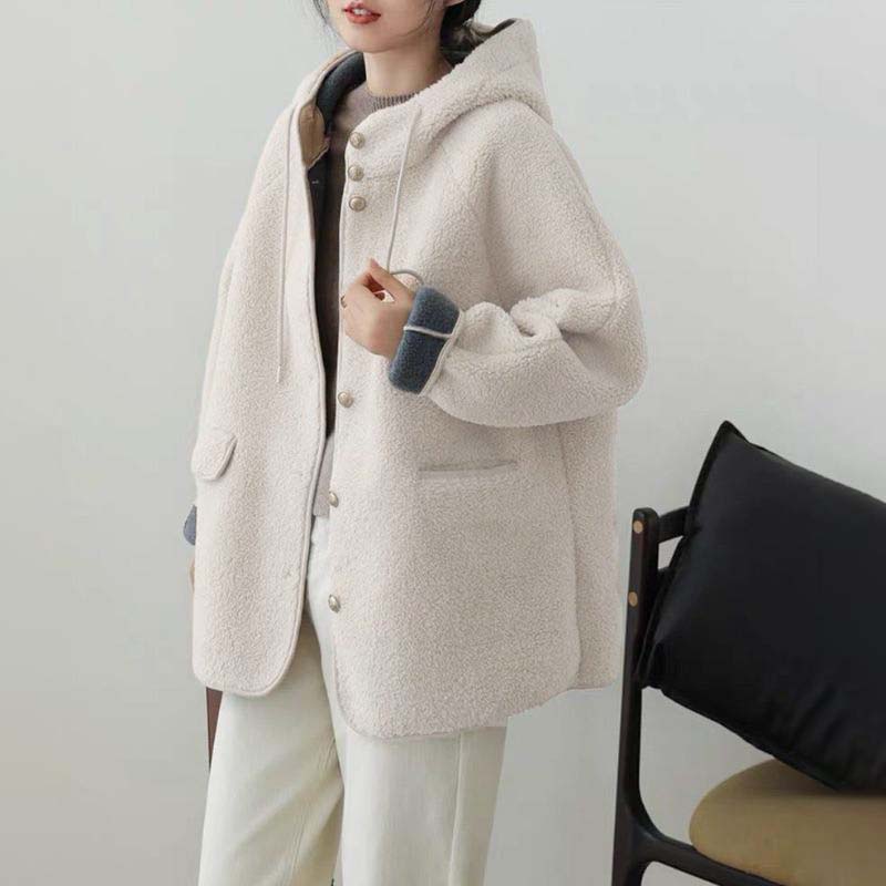 Damskie luźne kurtki z kapturem z wełny jagnięcej, swobodne, jednorzędowe, grube płaszcze, zimowe, ciepłe, z długim rękawem, z ziarnistego aksamitu